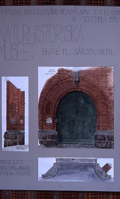 'Foton, teckningar och modeller av studenter från Chalmers Tekniska högskola, Institutionen för Arkitekturhistoria, Göteborg. Foton och teckningar av detaljer från Naturhistoriska museets byggader, byggnadsvård. :: :: Ingår i serie med fotonr. 6929:1-21.Entre till gården, portal''.'