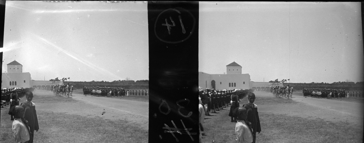 'Bildtext: ''''Drottningholms'' kryss till Södern: Sultanens militärparad.'' :: I förgrunden står 2 pojkar och 1 man. Vy med militärparad till fot och till häst, ryttare. I abkgrunden byggnad. :: :: Ingår i serie med fotonr 5266:1-16. Se även hela serien med fotonr. 5237-5267.'