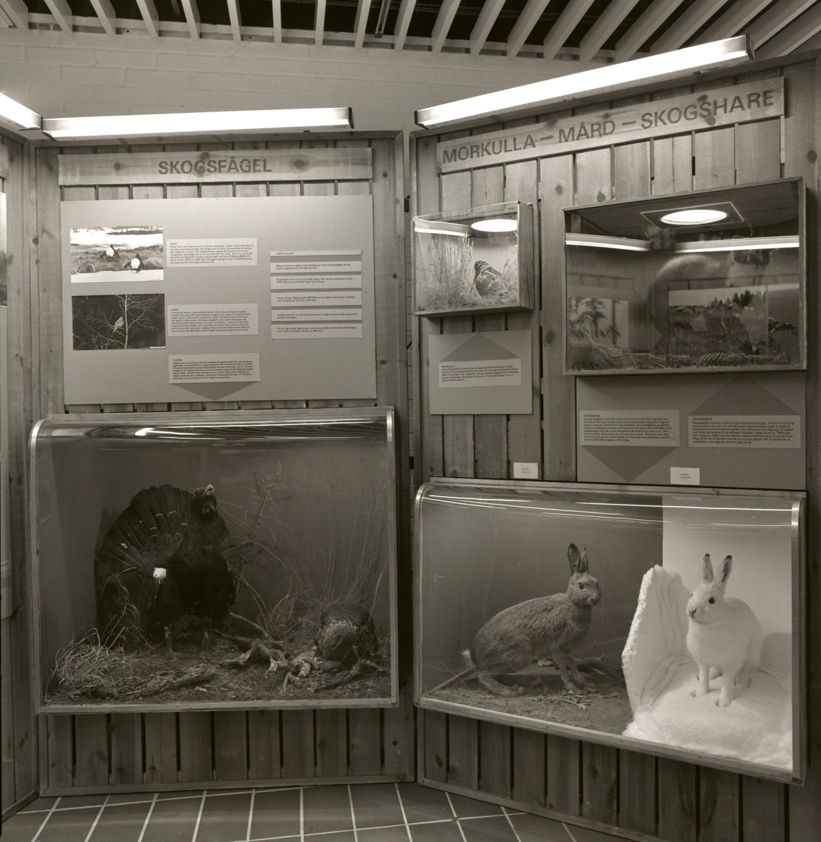 'Utställningen '' Viltet genom 150 år'' från Riksmuseet: :: :: Utställningsskärmar med bilder och texter med rubriker ''Skogsfågel'' och ''Morkulla - Mård - Skogshare''. Monterad skogshare och tjäder. :: :: Ingår i serie med fotonr. 5796:1-12.'
