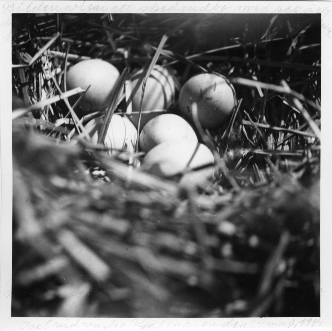'Enligt anteckning på fotografiets baksida: :: ''Bilden visar ett skedandbo med sex ägg. Det låg i en starrgrästuva, varifrån honan fkö upp c:a 20 meter från måsholmen. :: Reden betod av torrt starrgräs. :: Maken skedand flög upp ur en göl c:a 100 meter från makans bo.'' :: :: Ingår i en serie med fotonr. 4512:1-57 med diverse foton av fågelbon med ägg och ungar. Varje fotografi har utförliga anteckningar på sin baksida, kopierade från framsidan, spår av de på framsidan är fortfarande synliga.'