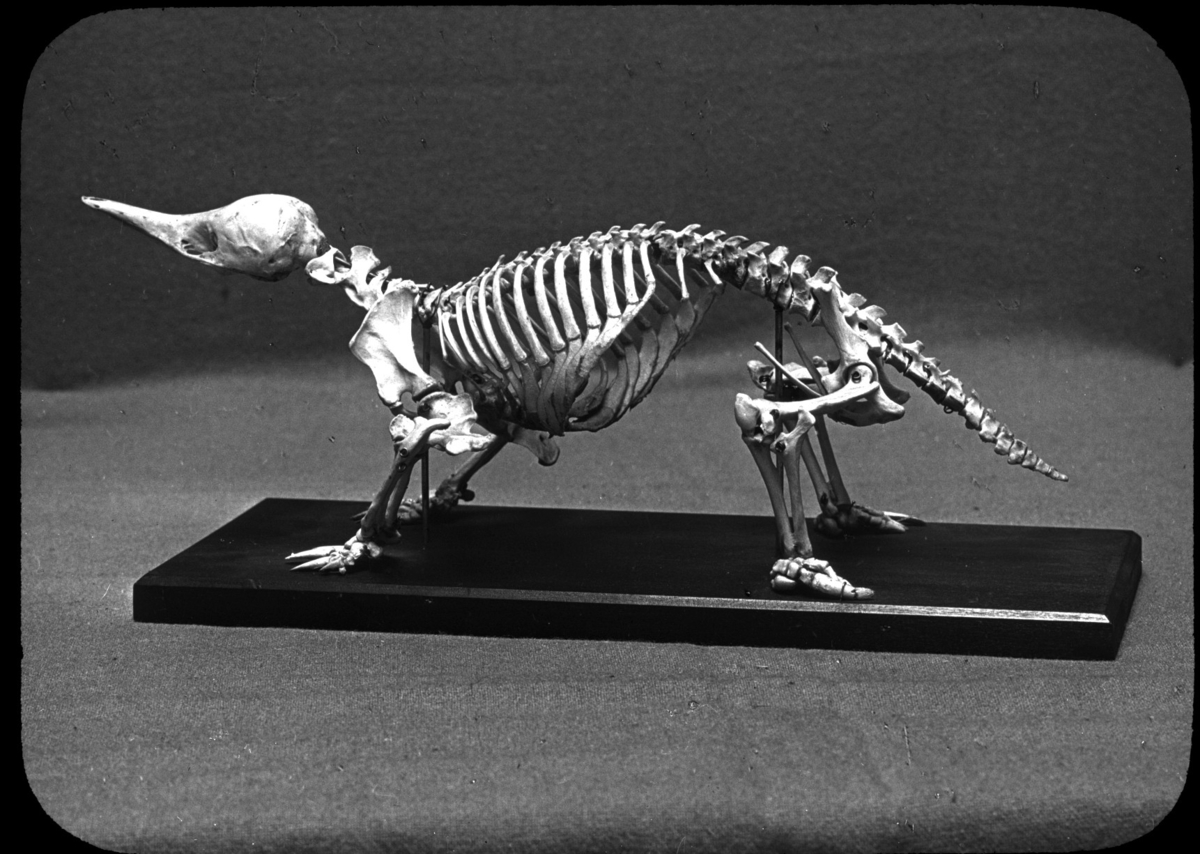 'Skelett av myrpiggsvin, sett från sidan. :: :: Från Dr. Schlüter & Mass, Halle a S naturvetens. Läromedel. Numrerade Serie I.A. Nr 1-30. :: :: Ingår i serie med fotonr. 5374:1-30. Se även hela fotoserien 5374-5376.'