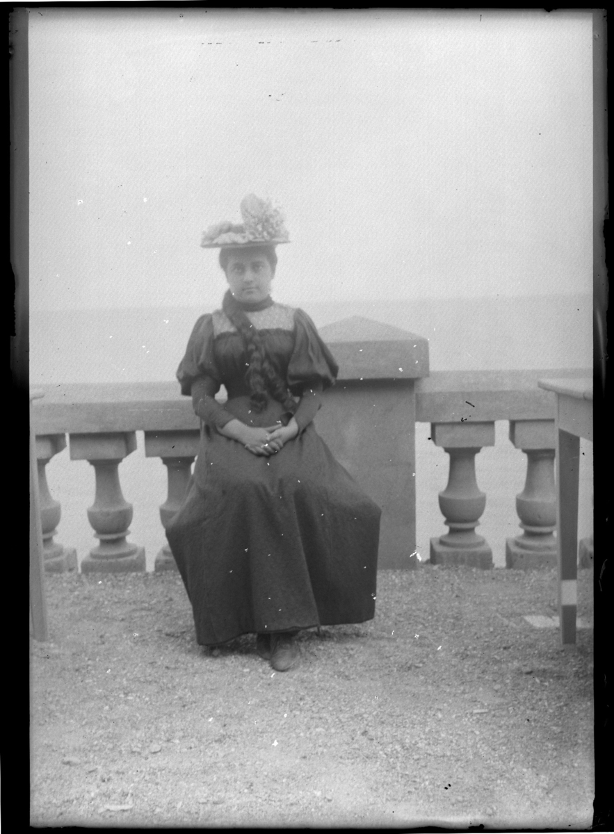 '1 kvinna sittande framför staket med ev. vatten, hav i bakgrunden. Lång fläta? Kläder. Klädsel. Hatt. Samma plats som fotonr. 5278:1. :: :: Ingår i serie med fotonr. 5278:1-21. Se även fotonr. 5269-5292 med bilder från Stuxbergs resa till Kaukasien.'