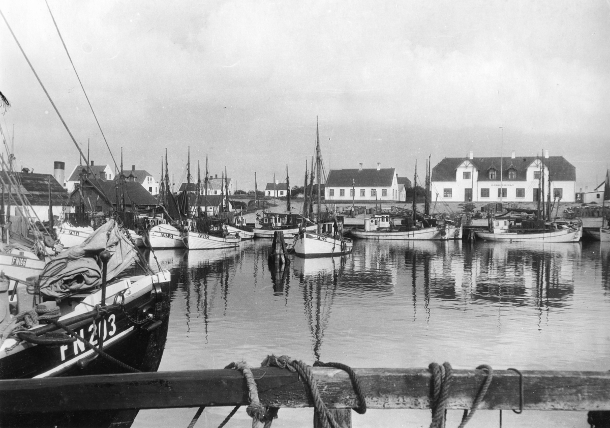 'Akka-expeditionen sommaren 1931: :: :: Vy med båtar i Vesterö hamn. Hus i bakgrunden. :: :: Ingår i serie med fotonr. 2182-2234.'