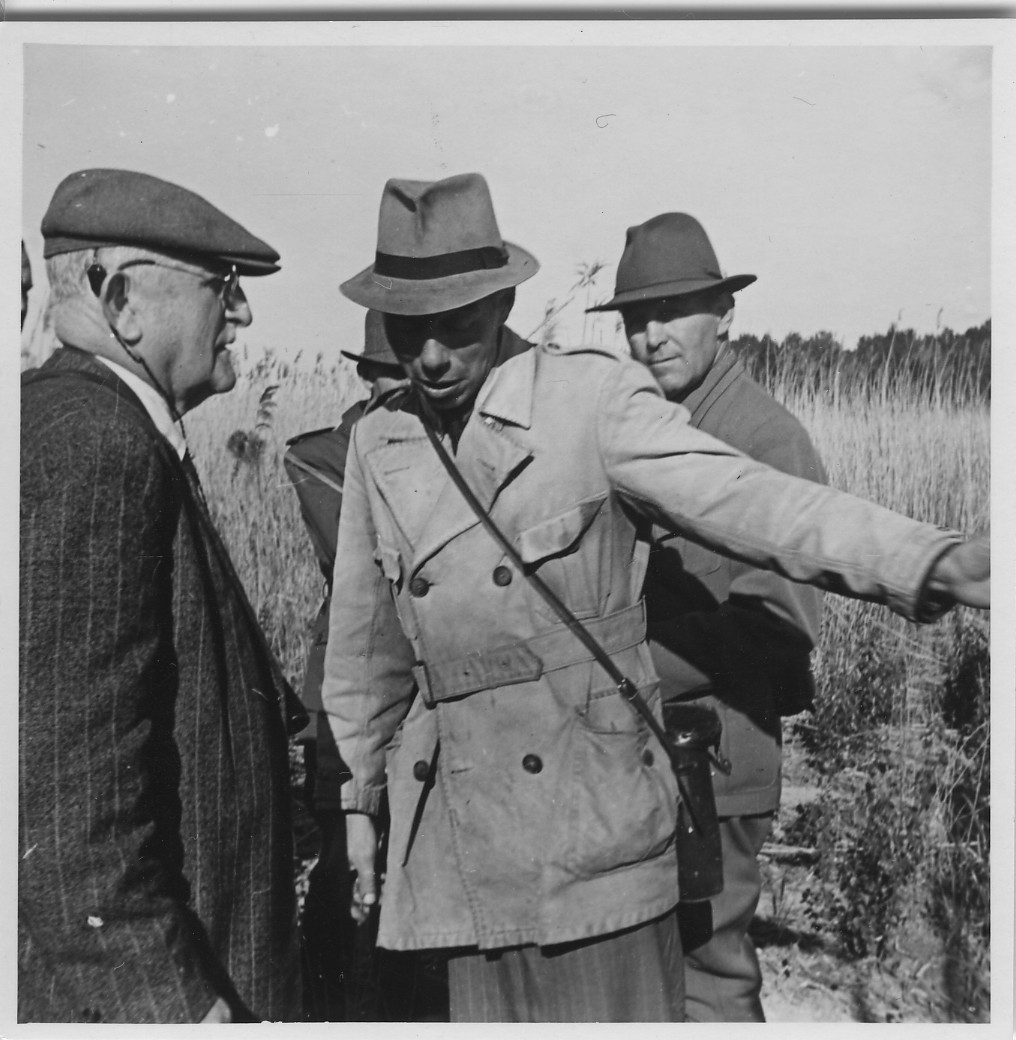 'Biologiska Föreningens utfärd till Oset och Kvismaren. :: :: Leonard Axel Jägerskiöld (längst till vänster) och Erik Rosenberg samtalandes vid vassen, i bakgrunden är ytterligare 2 män delvis synliga. :: :: Ingår i serie med fotonr. 4386:1-18.'