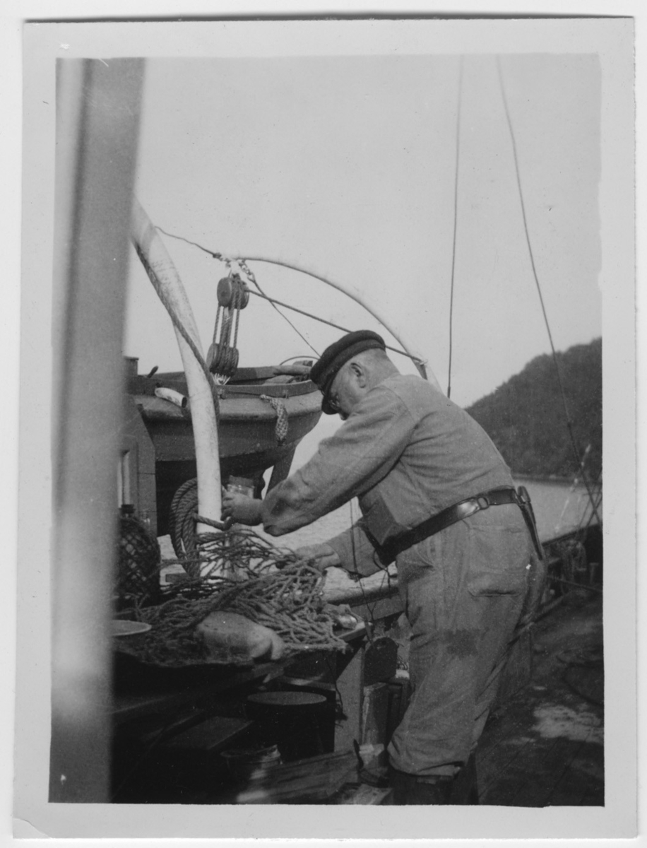 'Professor Leonard Axel Jägerskiöld ombord på båten ''Gunnerus''. Jägerskiöld stående på båtdäck med livbåt i bakgrunden. :: :: Se även fotonr. 4569.'