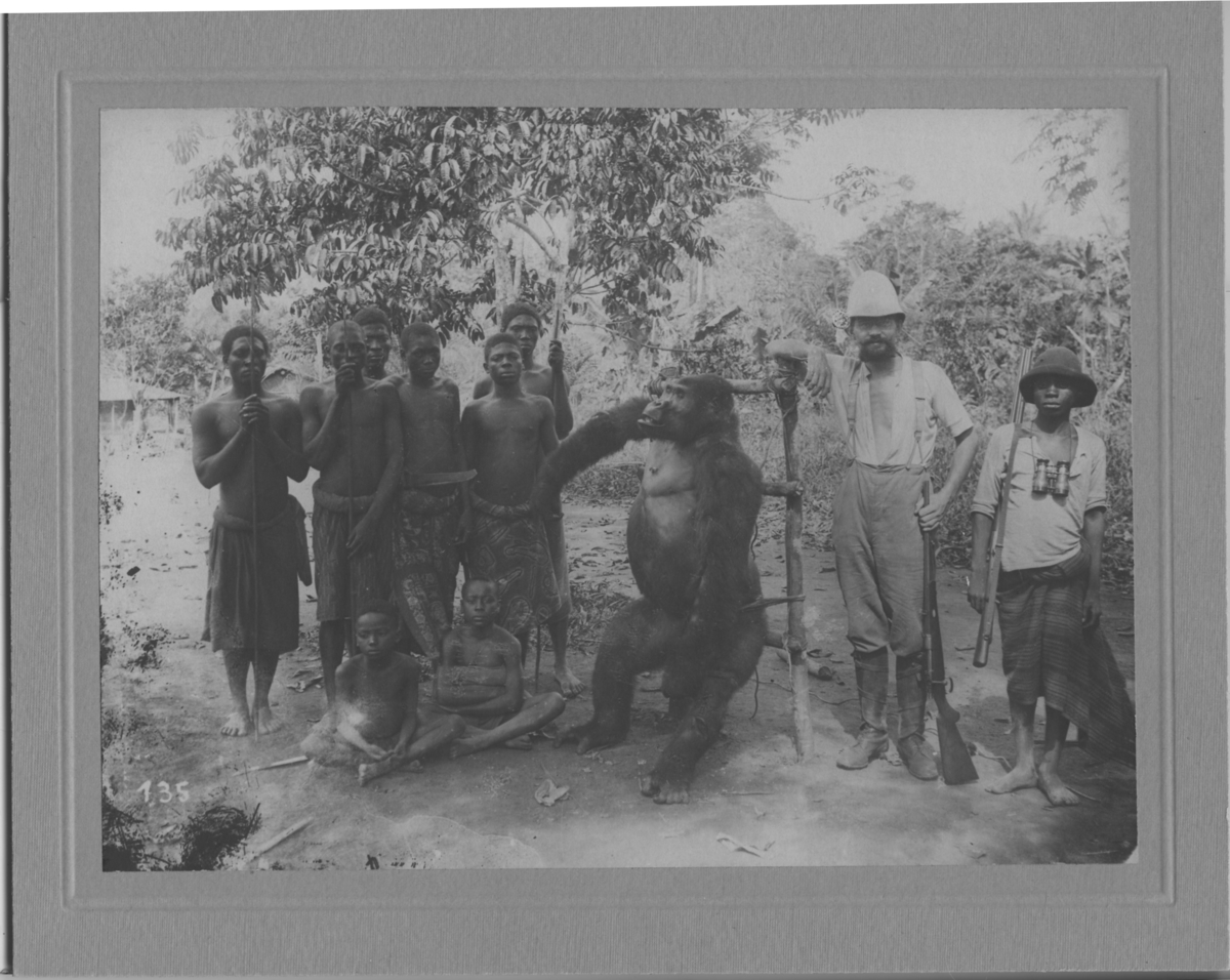 'Johannes Umlauf med jaktsällskap, och skjuten gorilla. :: 2 sittande pojkar och 7 stående män varav 1 bär gevär och 1 bär macheteliknande föremål. Gorilla stående fastsurrad mot bärställning. På högra sidan om gorillan står 2 st män (Johannes Umlauff ? Och 1 annan man) med vars ett gevär, hattklädda. :: Se även fotonr. 4978:1.'