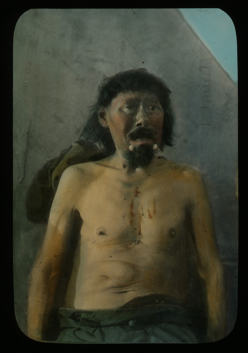'1 man med bar överkropp. Text på på glaset: ''Esquimeaux Chiestain.'' :: :: Ingår i serie med fotonr. 5203:1-22. Se även hela fotonr. 5202-5218 med bilder från Frits Johansen.'