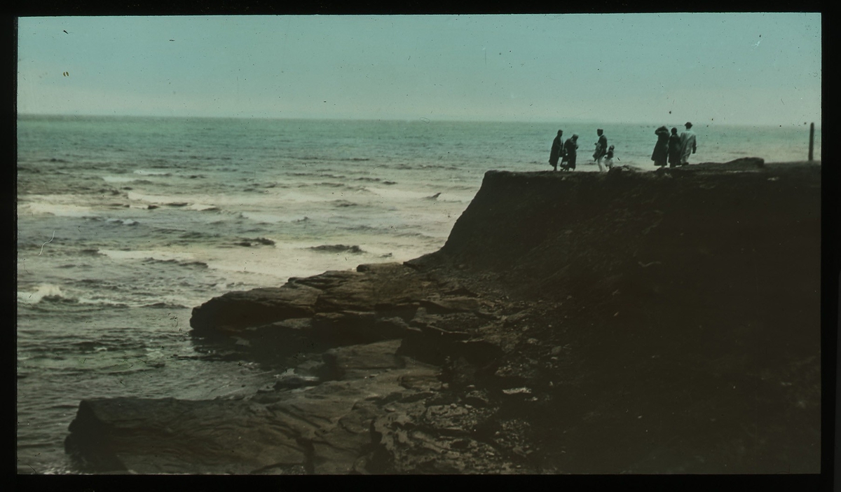 'Vy med klippa vid havet, ca 6 st människor ståendes på klippan. :: :: Ingår i serie med fotonr. 5204:1-19. Se även hela fotonr. 5202-5218 med bilder från Frits Johansen.'