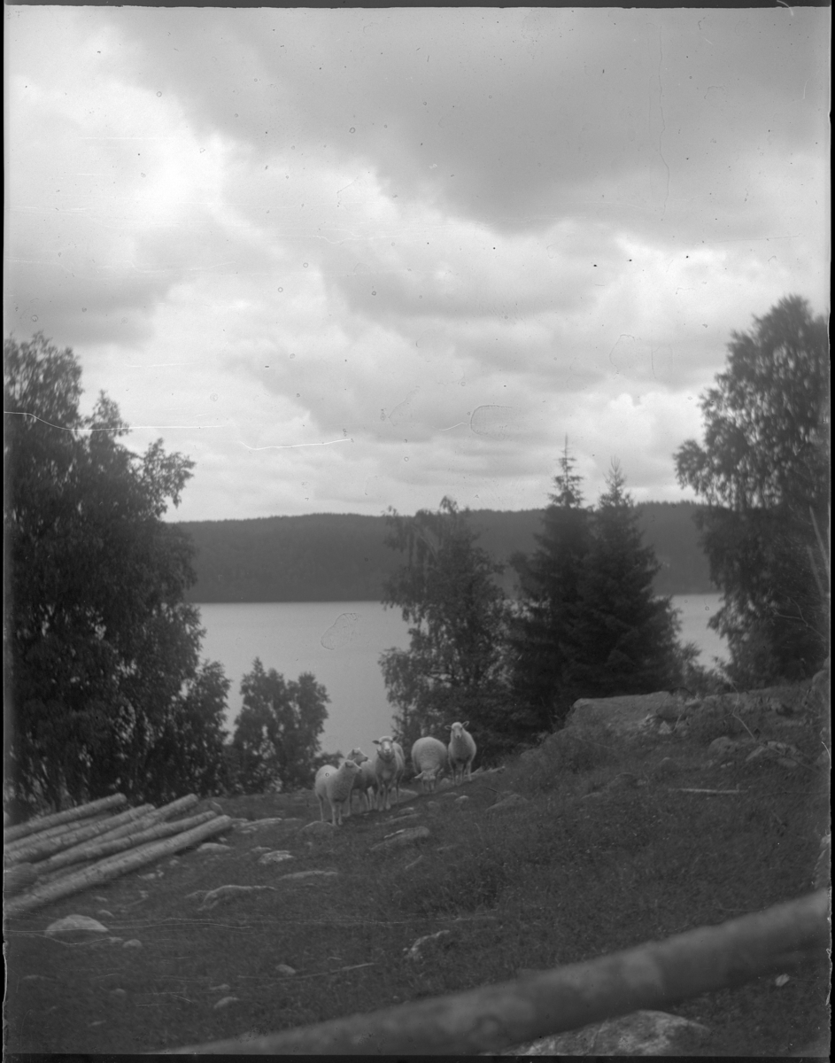 'Bildtext: ''Krappsäter.'' :: Vy ner över sjö. I förgrunden liten flock får och timmerhög. :: :: Ingår i serie med fotonr. 5230:1-11, se även fotonr. 5229:1-13'