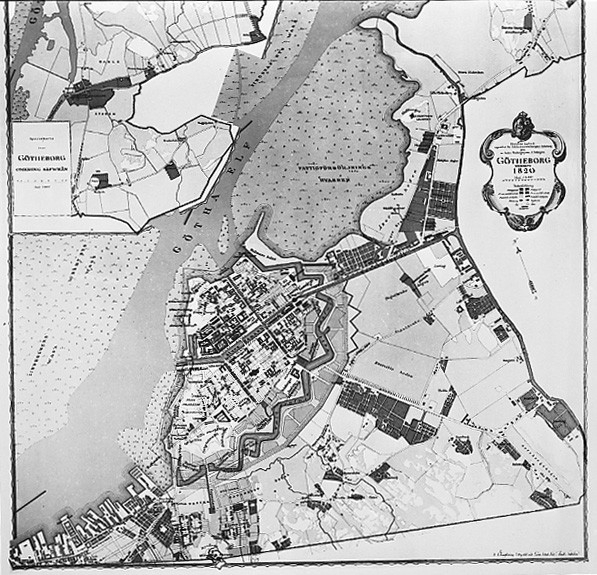 'Repro av sex porträtt av samt äldre Göteborgskarta. :: :: Avfotograferad äldre karta över Göteborg.'