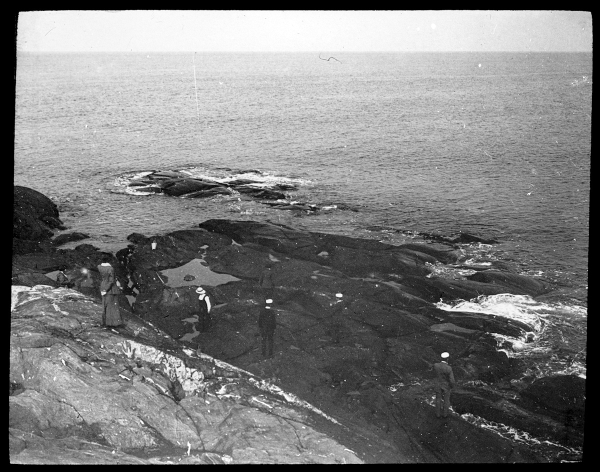 '2 kvinnor och 3 män, iklädda hattar och mössor, gående på klippa ner mot havet. Bildtext: ''På Bonden, plockande purpursnäckan.'' Se även fotonr. 5137:4. :: :: Ingår i serie med fotonr. 5139:1-36. Fotonr. 5139:1-17 ligger i en ask med texten ''med motiv från (enligt pappasken) Helgoland. För diapositiv.'' Fotonr. 5139:18-27 ligger i en pappask med texten: ''Helgoland (''Augusta'')'' en del för diapositiv. Fotonr. 5139:28-36 ligger i en ask med texten ''Dubbletter från Helgoland. Dessutom diapositiv från Kristineberg och Lysekil.'''