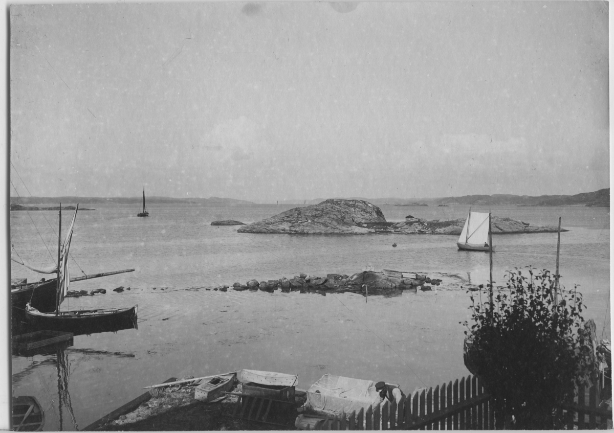 'Kristinebergs Zoologiska station. :: :: Gullmarsfjorden med båtar och klippor, fotograferad från stationen, med staket och buske i förgrunden. En man är också synlig på bilden. :: :: Ingår i serie med fotonr. 5103:1-24.'