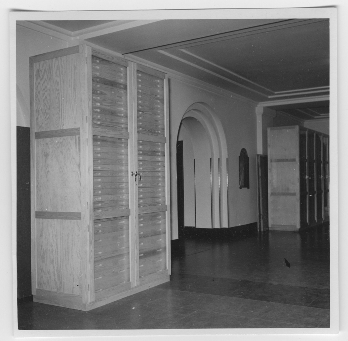 'Skåp med lådor i utställningen. :: Everteskåp i vestibulen vid gamla entrén. :: Ingår i serie med fotonr. 6964:1-11.'