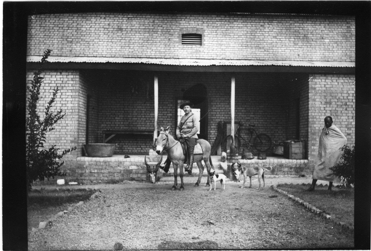 'Diverse fotografier från bl.a. dåvarande Nordrhodesia, nu Zambia, tagna av Konsul Magnus Leijer. :: :: 1 st man med gevär på ryggen sitter på en åsna, bredvid åsnan står 2 hundar och längre bort 1 st man. Samtliga framför en tegelbyggnad.'