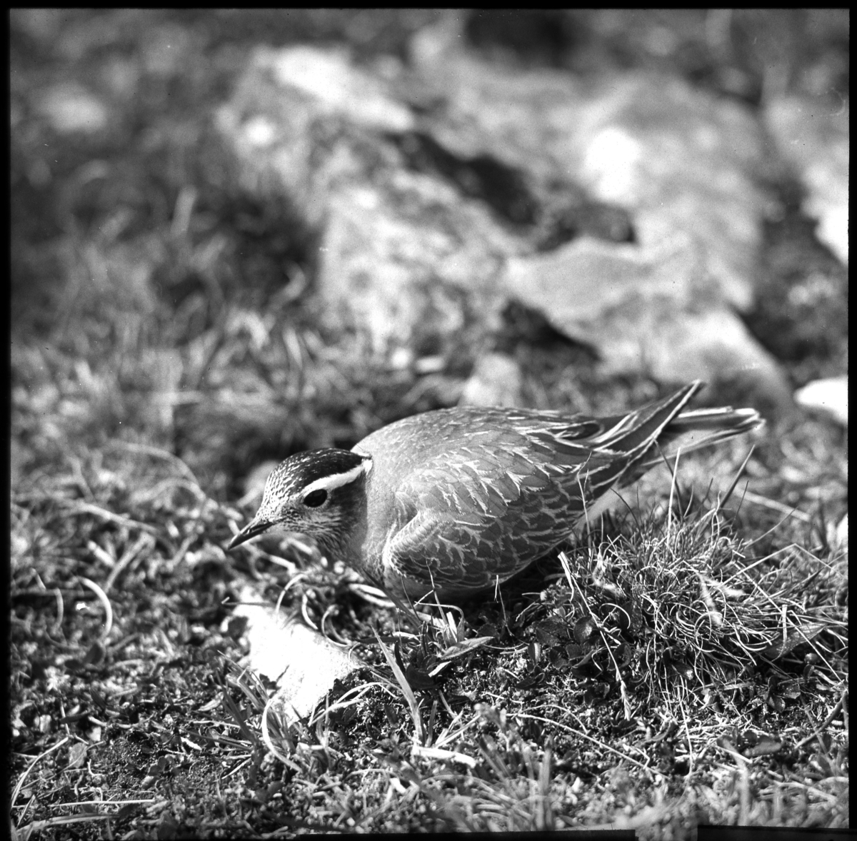 'Bildtext: ''Fjällpipare, simulerar.'' Fjällpipare, närbild, sedd från sidan. :: :: Ingår i serie med fotonr. 5159:1-9 numrerade med bildnr 139-147. Se även hela fotoserien med fotonr. 5155-5174.'