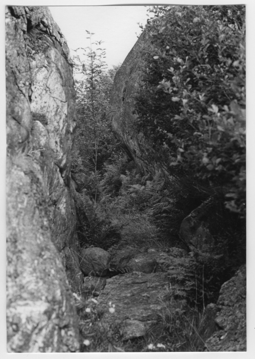 'Bildtext: ''Spricka.'' Närbild med vegetation i sprickan. :: :: Ingår i serie med fotonr. 6970:1-1125, dokumentation av Hisingens naturgeografi, visande landskapsformerna i stora drag och gjord inför exploateringen av området. Platserna för fotograferingen finns utsatta på karta i skala 1:4000 som finns på Göteborgs Naturhistoriska musem. Fotoriktningen mättes med kompass i gammalgrader.'