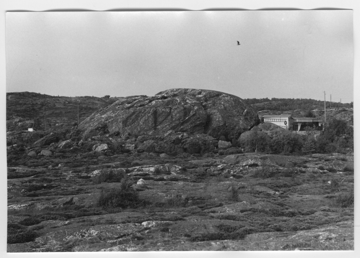 'Bildtext: ''Granitkupol. Riktning 34.'' Vy med berg av granit. Någon typ av byggnad, skjul intill. :: :: Ingår i serie med fotonr. 6970:1-1125, dokumentation av Hisingens naturgeografi, visande landskapsformerna i stora drag och gjord inför exploateringen av området. Platserna för fotograferingen finns utsatta på karta i skala 1:4000 som finns på Göteborgs Naturhistoriska musem. Fotoriktningen mättes med kompass i gammalgrader.'