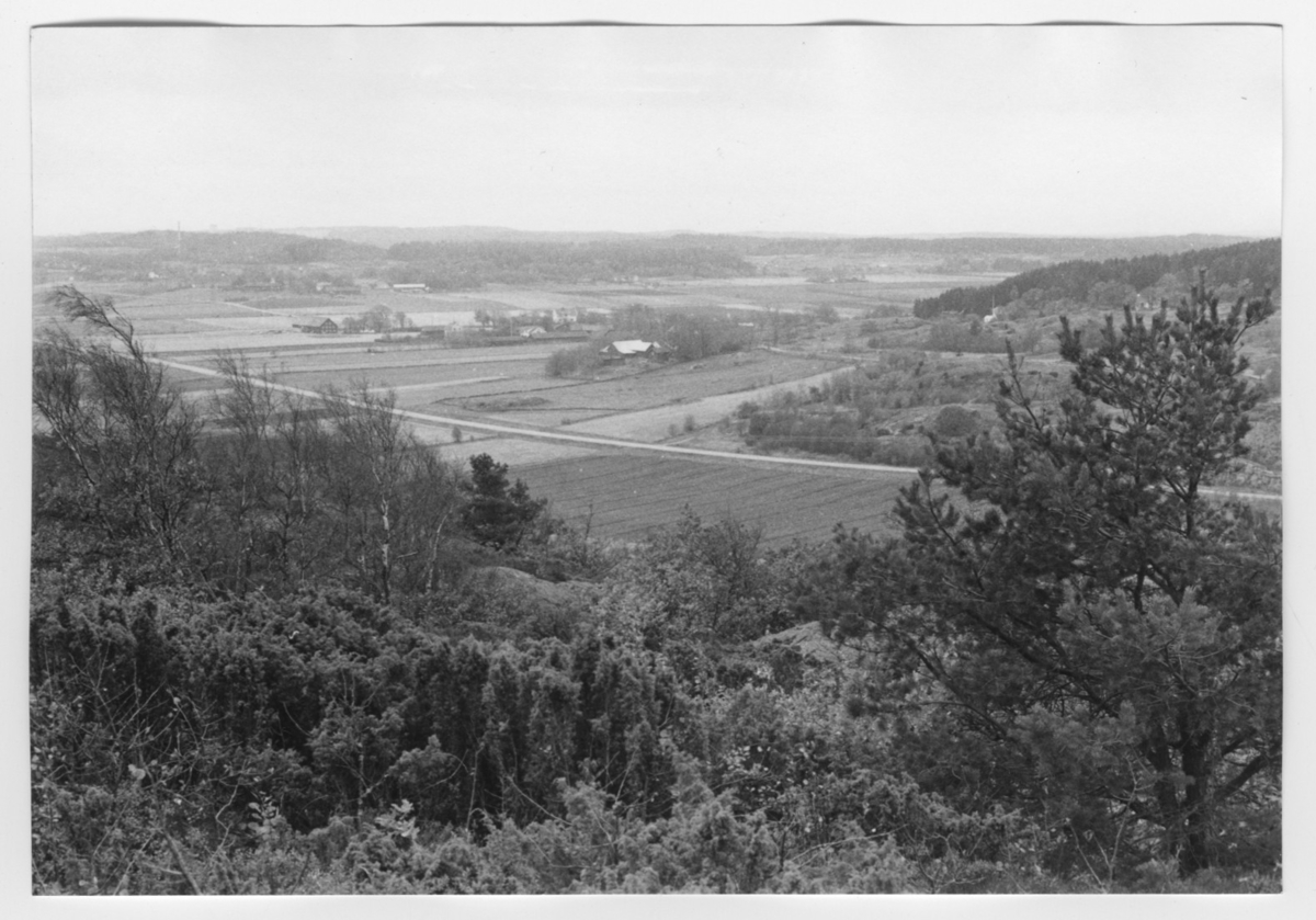'Bildtext: ''Kvillens dalgång. Riktning 222.'' Vy ner över dalgången med åkermark och gårdar och hus. :: :: Ingår i serie med fotonr. 6970:1-1125, dokumentation av Hisingens naturgeografi, visande landskapsformerna i stora drag och gjord inför exploateringen av området. Platserna för fotograferingen finns utsatta på karta i skala 1:4000 som finns på Göteborgs Naturhistoriska musem. Fotoriktningen mättes med kompass i gammalgrader.'