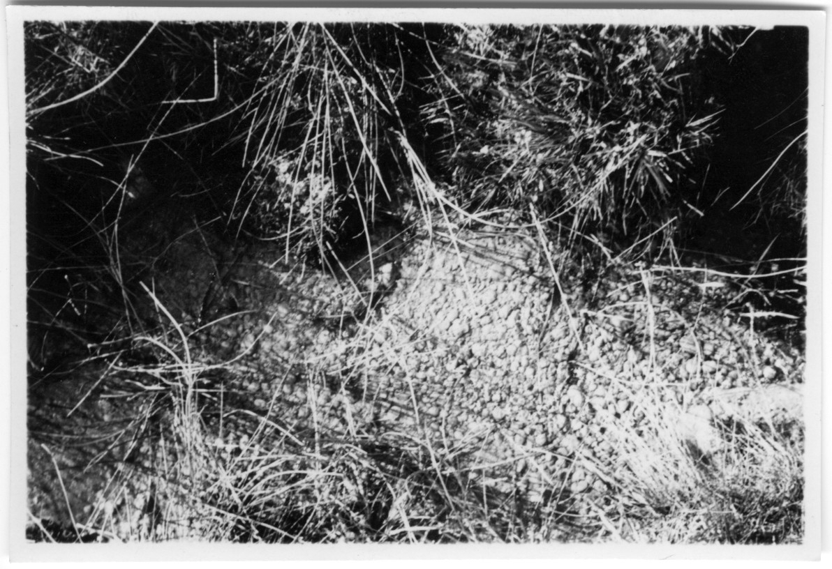 'Fyndplats av bollar, konkretioner. Närbild med bollar och grästuvor. :: :: Låda 469 i geologisamlingen. :: :: Ingår i serie med fotonr. 6046:1-11.'