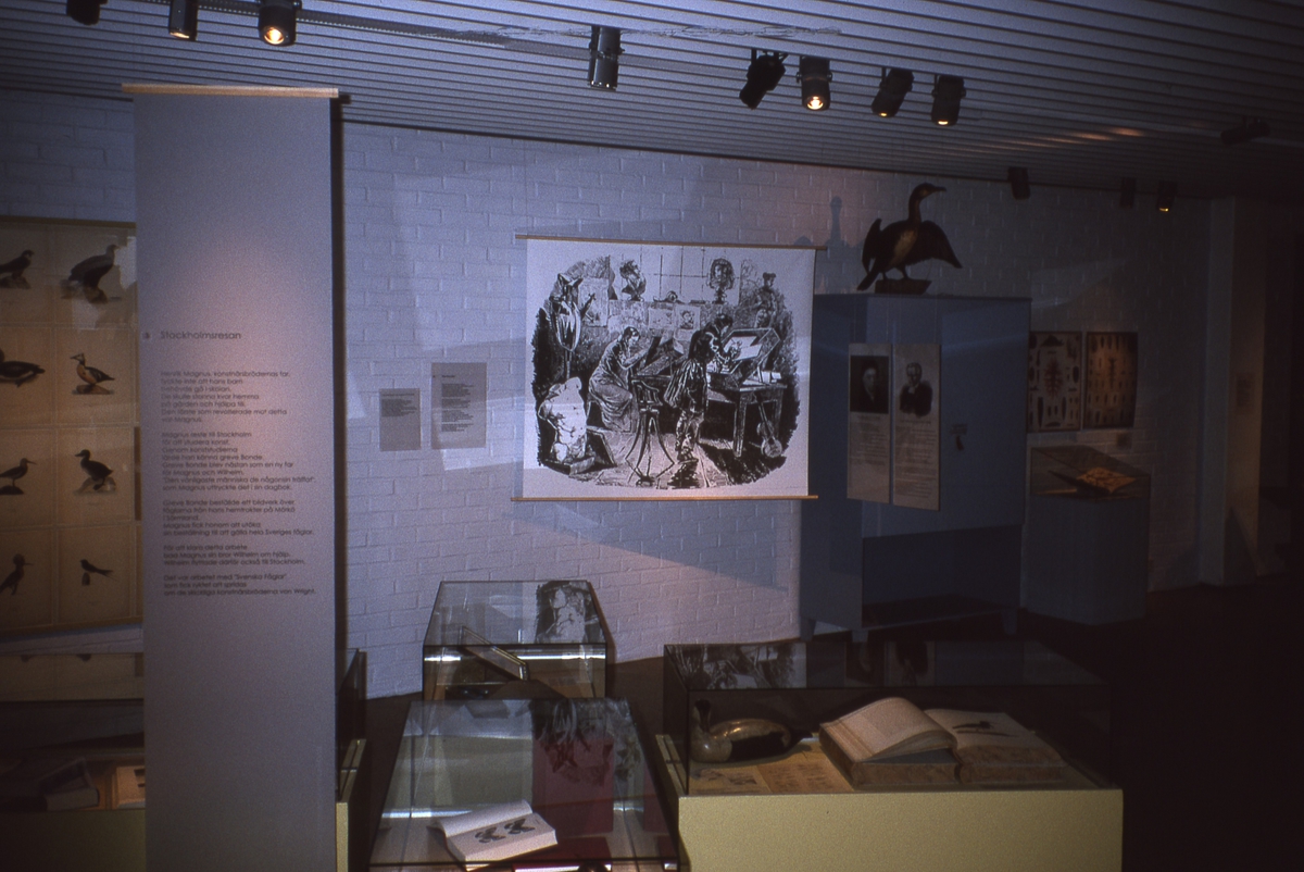 'Motiv av utställningen om konstnärsbröderna von Wright på Göteborgs Naturhistoriska museum: :: :: Glasmontrar. :: :: Ingår i serie med fotonr. 6938:1-35.'