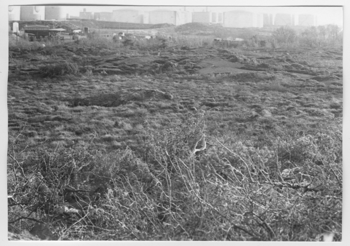 'Bildtext: ''Sumpmark. Kärr. Riktning 180.'' :: Vy över öppen yta, sumpmarken med silos i bakgrunden. :: :: Ingår i serie med fotonr. 6970:1-1125, dokumentation av Hisingens naturgeografi, visande landskapsformerna i stora drag och gjord inför exploateringen av området. Platserna för fotograferingen finns utsatta på karta i skala 1:4000 som finns på Göteborgs Naturhistoriska musem. Fotoriktningen mättes med kompass i gammalgrader.'