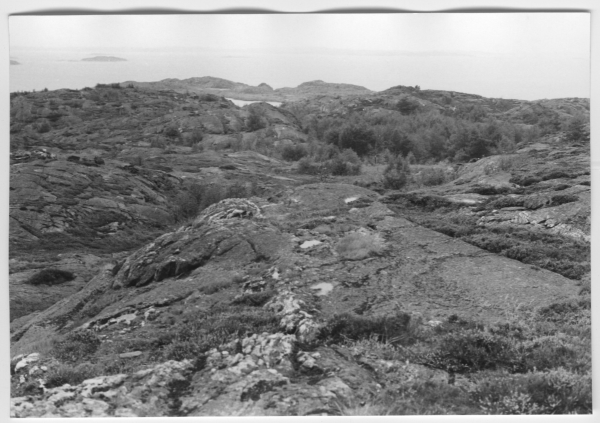'Bildtext: ''Hällparti. Riktning 250.'' Vy över delvis kal berghäll med ljungvegetation. I sänka trädvegetation. Vy med skymt av havet. :: :: Ingår i serie med fotonr. 6970:1-1125, dokumentation av Hisingens naturgeografi, visande landskapsformerna i stora drag och gjord inför exploateringen av området. Platserna för fotograferingen finns utsatta på karta i skala 1:4000 som finns på Göteborgs Naturhistoriska musem. Fotoriktningen mättes med kompass i gammalgrader.'