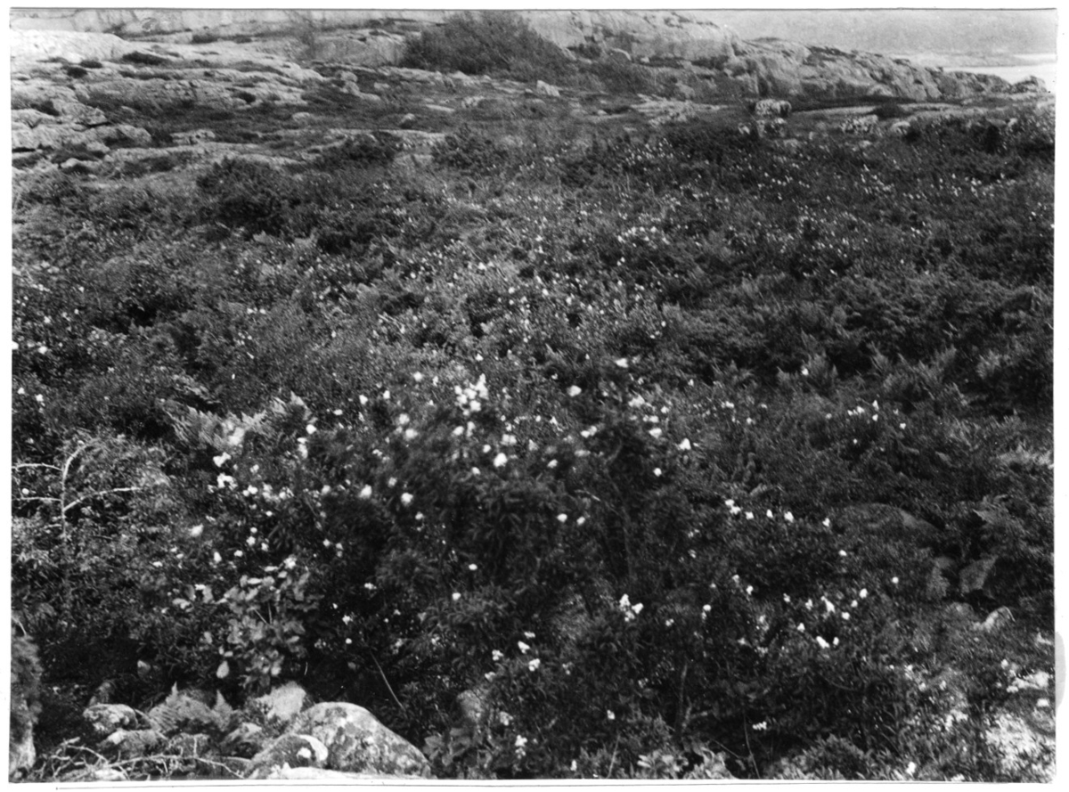'Bildtext: ''Massor av blommande Ligustrum vulgare.'' Närbild på blommande dvärgliguster. Berghällar i fonden. :: :: Fotonr. 7046:213-233 indelade som ''Buskar, blommor m.m.'' i Göteborgs län och Bohus län''.Ingår i serie med fotonr. 7046:1-383, 7047:1-33 och 7048:1-67 med bilder från Länsjägmästare John Lindners bildarkiv.'