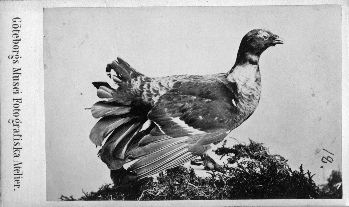 'Monterad orre. :: :: Text till bilden: ''Orren, med sin klufna stjert, är derigenom väl skild från våra öfriga arter af slägtet. Hos honan är likväl detta mondre märkbart. Han finnes ganska allmänt i hela vårt land både i skogar och i skoglösa men vilda trakter, men helst nedslår han sina bopålar der, hvarest björken växer till större träd. Han går ej så högt upp i fjellen eller mot norden som tjädern och öfverskrider ej granens region, då denna art deremot är allmän, så långt upp som furen bildar skog. Om vintern äter han björkknopp, annars späda blad och bär af flerfaldiga slag. Särdeles efterfrågad för köttet, eftersökes han flitigt af vår landtbefolkning, men då han likasom så många andra hönsfoglar bringar till verlden en stor skara af ungar, är han ej så lätt att utrota, om ock många orter finnas, i hvilka äfven denna prydliga skogsfogel numera saknas. Denna hans stora fortplantningsförmåga gör ock, att orren inom loppet af 3-4 år hastigt förökar sig å en ort, der han nästan är utskjuten, blott man skonar honom och ej i otid förstör ynglet.'' /August Wilhelm Malm år 1866. :: :: :: Serie med fotonr. 7079:1-37. Fotografierna är monterade i en liten bok, inbunden, med titel ''Fotografier öfer Däggdjur och foglar. Texter av A. W (1866). Malm. Boken återfinns i Göteborgs Naturhistoriska Museums bibliotekssamling under ''Äldretryck''. På baksidan av varje foto finns en text om arten. :: :: Se även fotonr. 5693:1-4.'