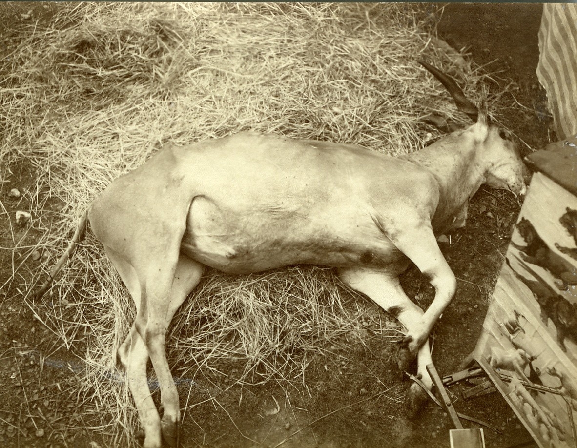 'Sabelantilop liggande på hö i ''spilta'' . Intill plansch med ''cirkusmotiv''. Närbild. Död i fångenskap på Cuneos menageri Göteborg 1910-08-19. Coll.an 4638 :: :: Finns utställd i däggdjurssalen, monterskåp 49. :: :: Ingår i serie med fotonr. 506-513.'