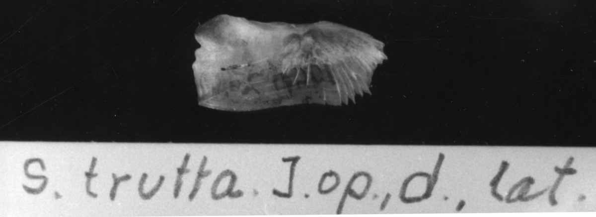 'S. trutta. J. op., d., lat. :: Salmo trutta Interoperculum, dexter, lateralt) :: :: Ingår i serie med fotonr. 7094:1-48'
