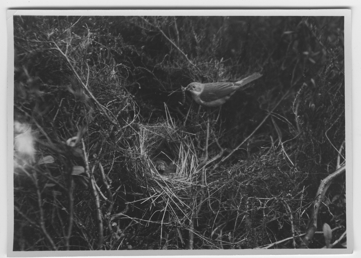 'Törnsångare, med byte i näbben, vid boet med ungar. Se även fotonr. 1344. :: :: Se serie med fotonr. 1305-1356.'
