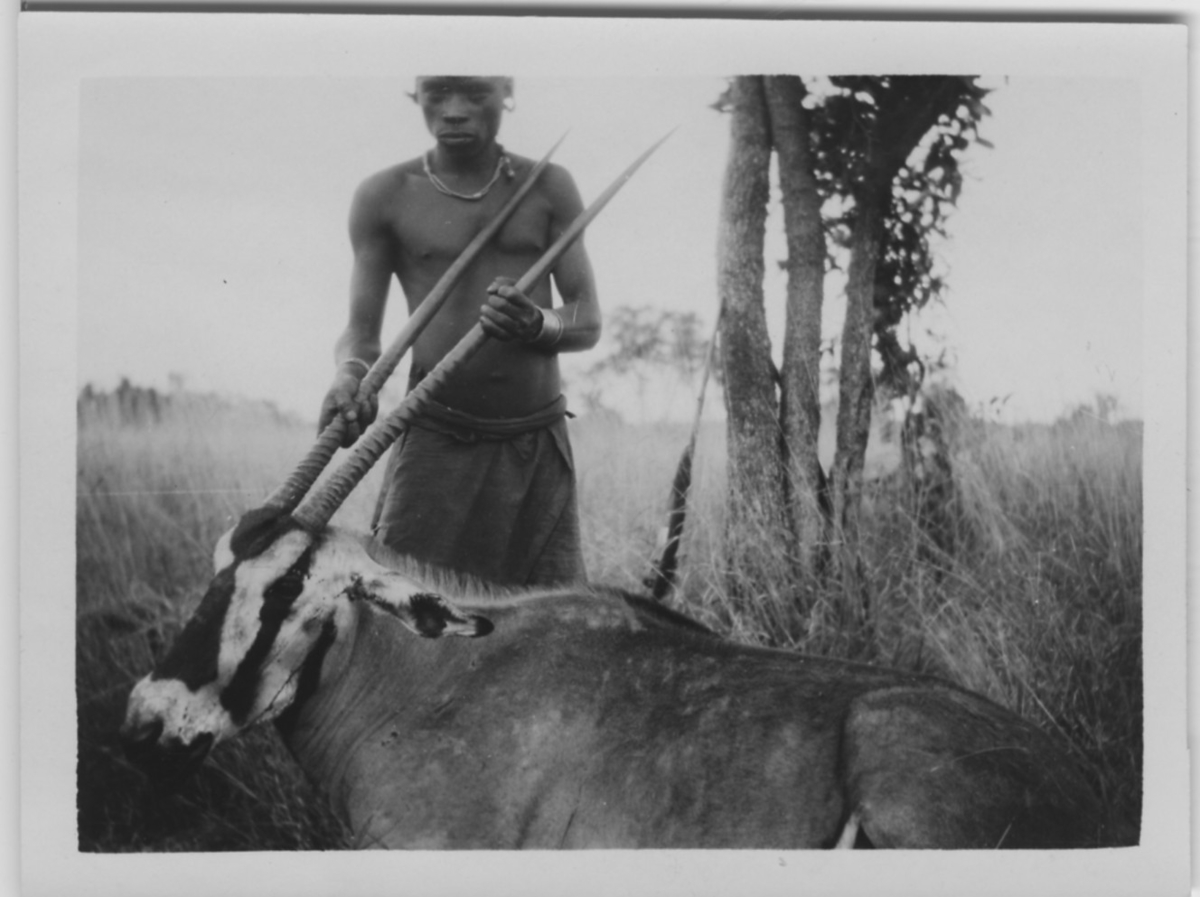 'Beisa (enligt baksidan av fotografiet), skjuten. 1 man håller upp huvudet genom att hålla i hornen. Stäpp. :: :: Serie fotonr 1434-1449'