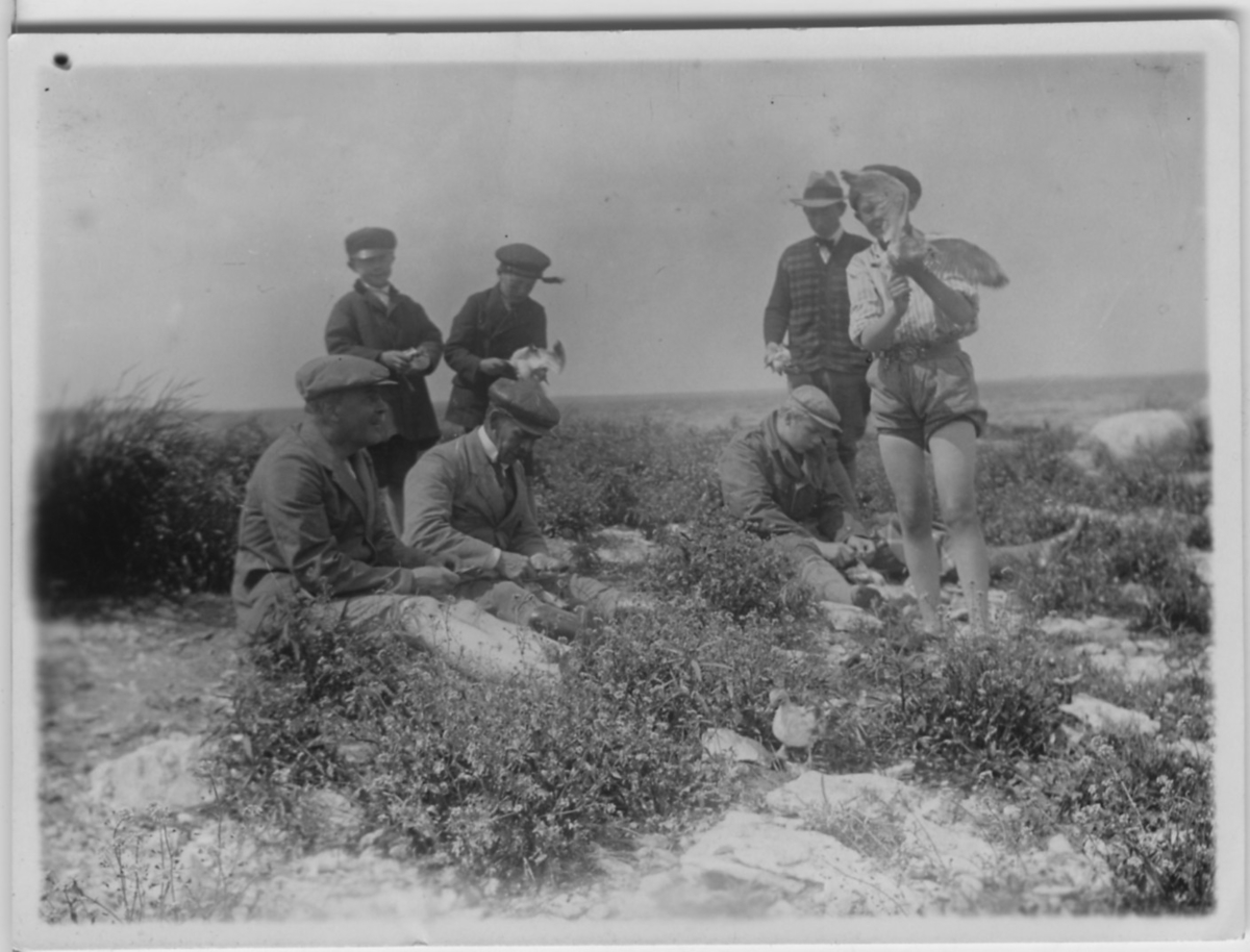 'Ringmärkning av skrattmåsar, 7 personer (3 män och 4 pojkar) iklädda keps, mössa. Med måsar i händerna. :: :: Se även fotonr. 1468.'
