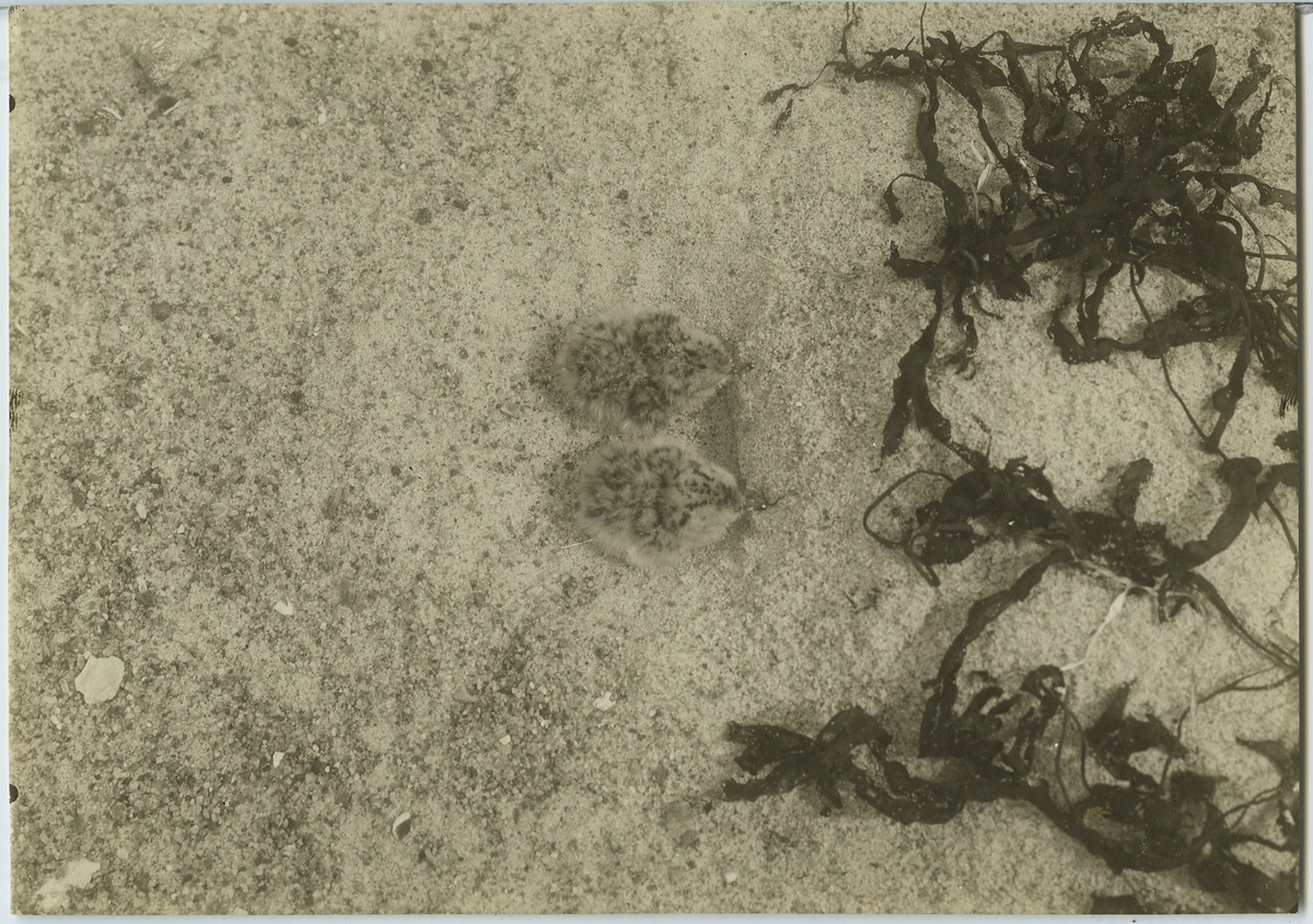 Småtärna, 2 ungar i sand vid tång. Närbild.