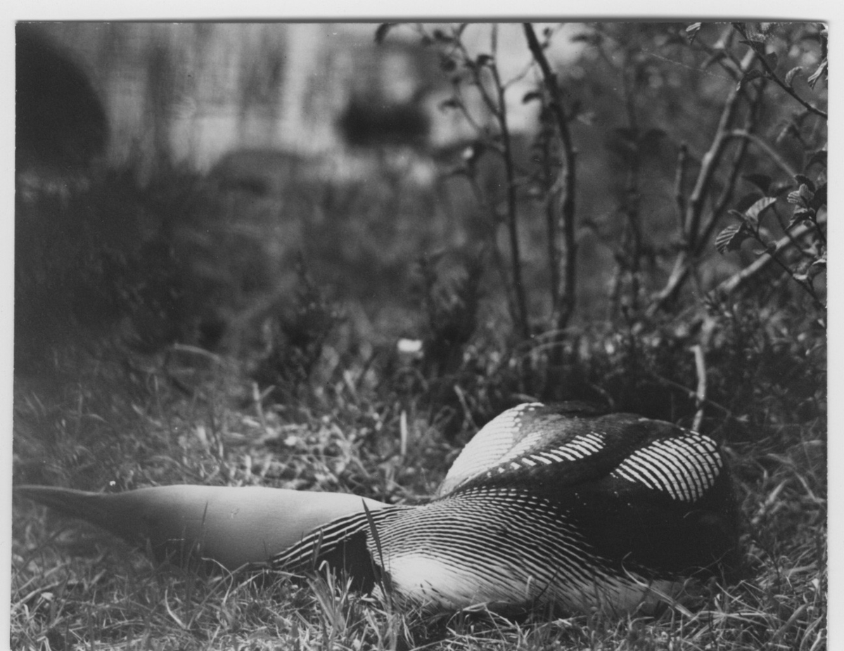 '1 storlom i försvarsställning mot förbipasserande skrake. Storlommen ligger ner helt, vid boet. Närbild. :: :: Ingår i serie med fotonr. 3550-3567. Se särskilt fotonr. 3551-3554.'