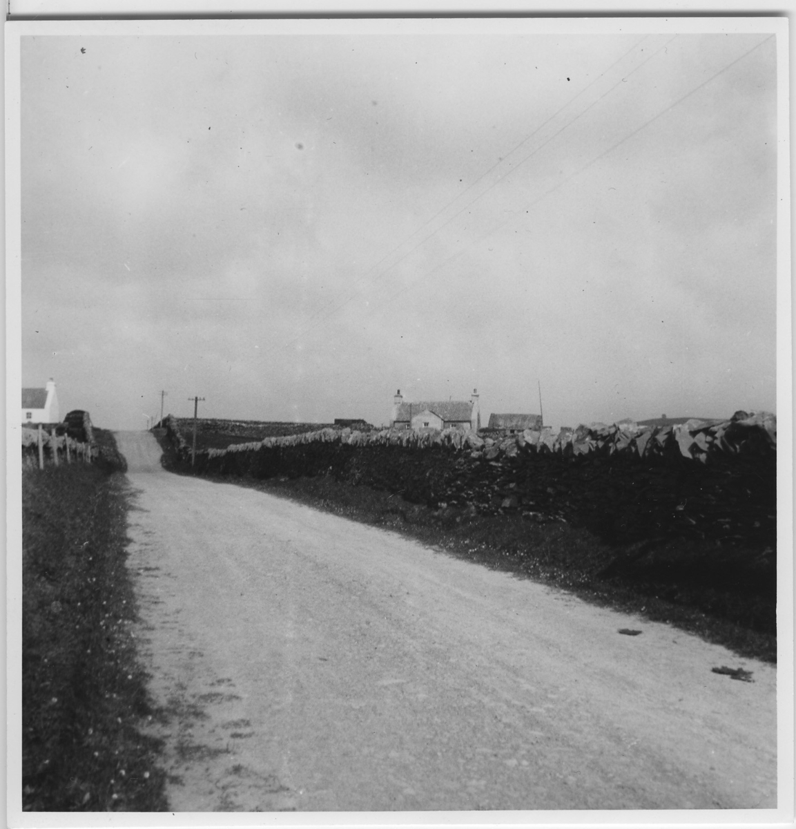 'Från ''Skageraks''-expeditionen till Hebriderna och Shetland: :: :: Vägen över Bressay till Noss. Hus, stenmur, väg och ledningar synliga. Stengärdesgård. :: :: Ingår i serie med fotonr. 4113:1-82.'