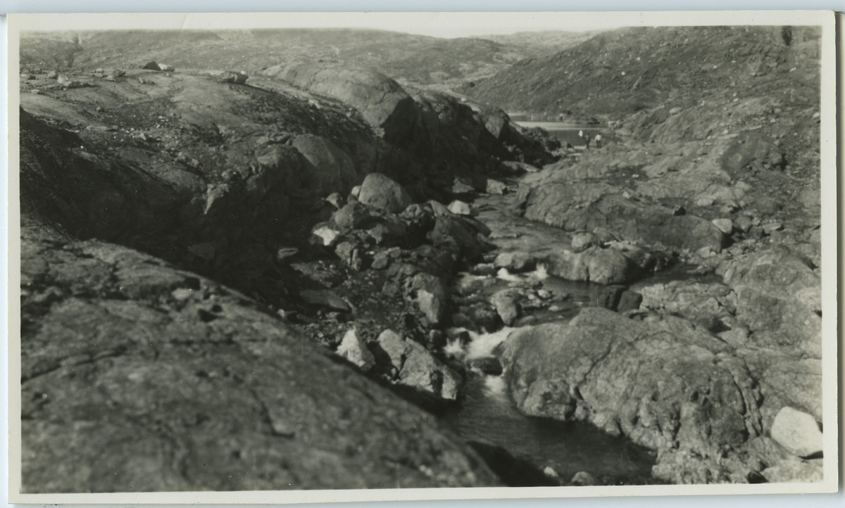 'Vy över vattendrag som rinner mellan berg. Människor stående ovanför. :: :: Ingår i serie Fotonr. 5217:1-103. Se även hela fotonr. 5202-5218 med bilder från Frits Johansen.'
