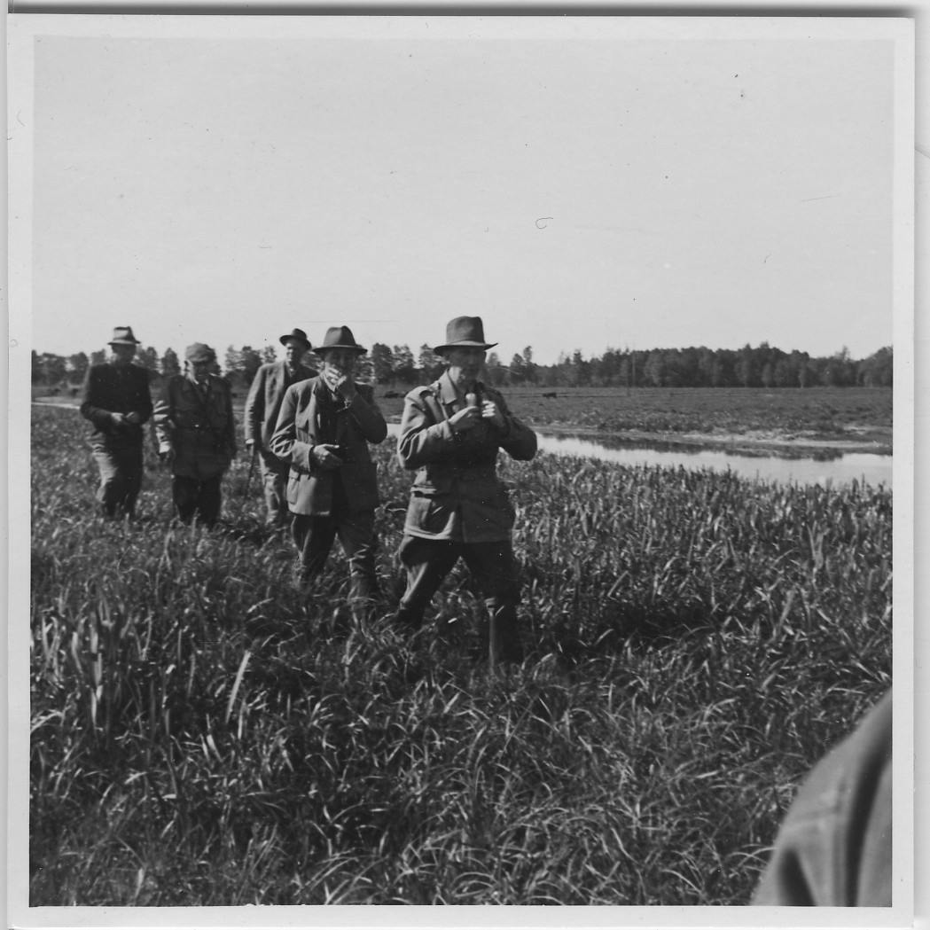 'Biologiska Föreningens utfärd till Oset och Kvismaren. :: :: 5 män promenerandes intill ett vattendrag 7 våtmark. Kläder. Klädsel. Ev. Leonard Axel Jägerskiöld nästa längst bak. :: :: Ingår i serie med fotonr. 4386:1-18.'