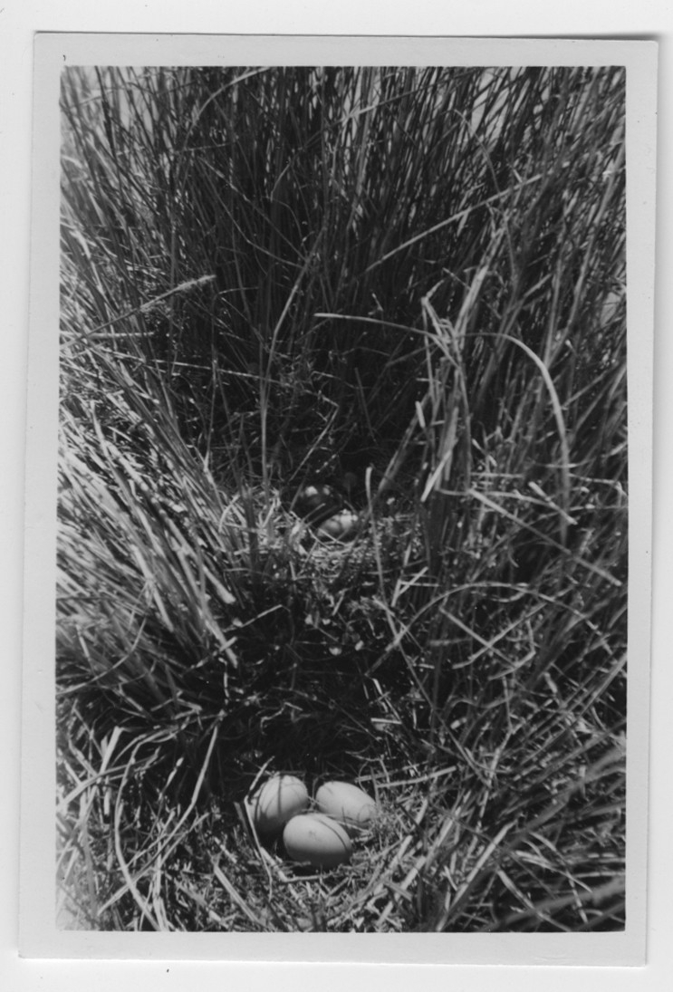 'Text enligt foto: ''Bo med 3 st nyvärpta ägg av småskraken vid ett fiskmåsbo med 2 st starkt ruvade ägg. Avståndet mellan de båda bona är 2 dm. De låg vid en stor sten till vänster om dem, ungefär 15 meter från stranden i Knisa mosse. Fotot är taget på 1 meters avstånd. Tydligen är det ont om lokaler för bobyggande på denna mosse.'' :: :: Ingår i serie med fotonr. 4500:1-172.'