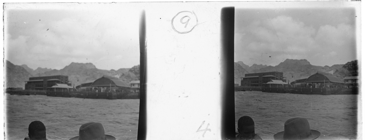'2 hattar synliga i förgrunden, personerna ser ut att titta ut över vattnet och byggnader på andra sidan. Enligt text till fotot: ''Prince of Wales´Pier.'' (Prinsen av Wales piren.) :: :: Ingår i en serie med fotonr. 5240:1-17. Se även fotonr. 5237:1-16, 5238:1-18 och 5239:1-18, 5241:1-18.'
