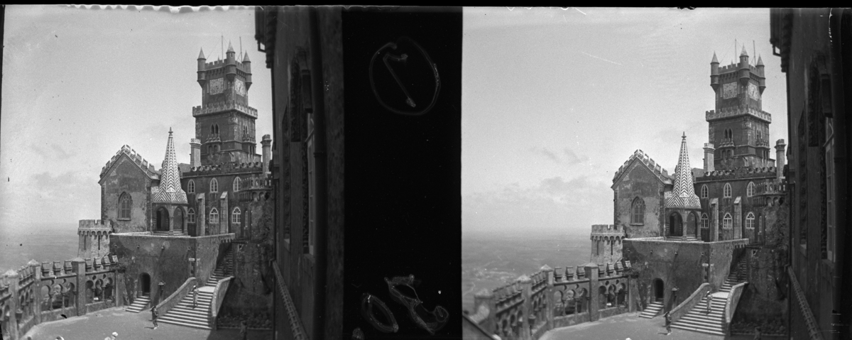 'Bildtext: ''''Drottningholms'' kryss till Södern: Klocktornet.'' :: Vy med del av The Pena National Palace, människor gående i trappa ner. :: :: Ingår i serie med fotonr 5266:1-16. Se även hela serien med fotonr. 5237-5267.'