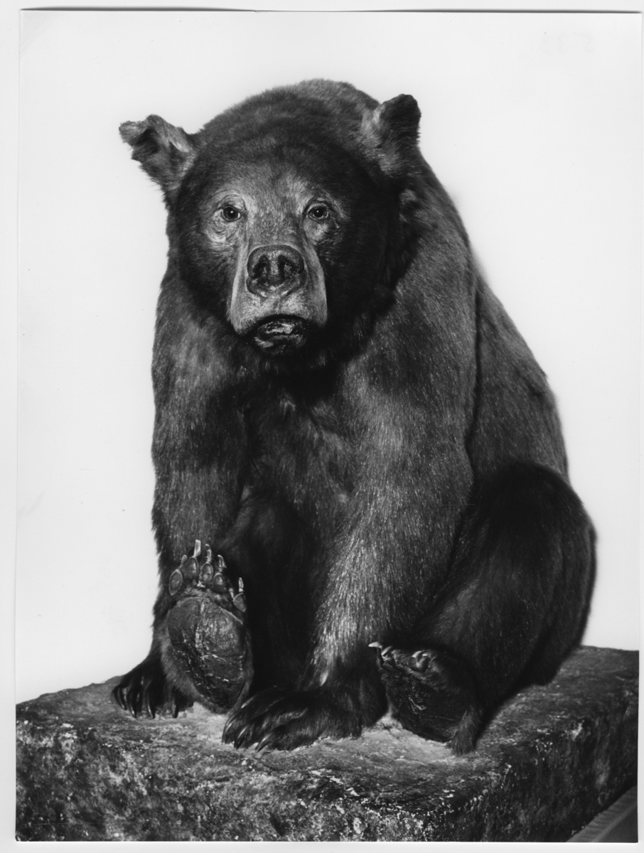 'Bilder från Göteborgs Naturhistoriska museum tagna som övningsuppgift av fotografer på Göteborgs Stads yrkesskolor: :: :: Svart björn i utställningen, stående till vänster om ingången till däggdjurssalen. Sedd framifrån. :: :: Ingår i serie med fotonr. 6953:1-53.'