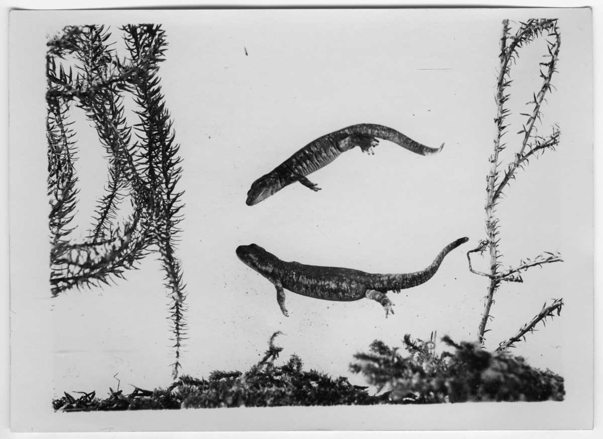 '2 st vattenödlor :: :: Ingår i serie med fotonr. 7015:1-91 med bilder av reptiler från Otto Cyréns samling.'