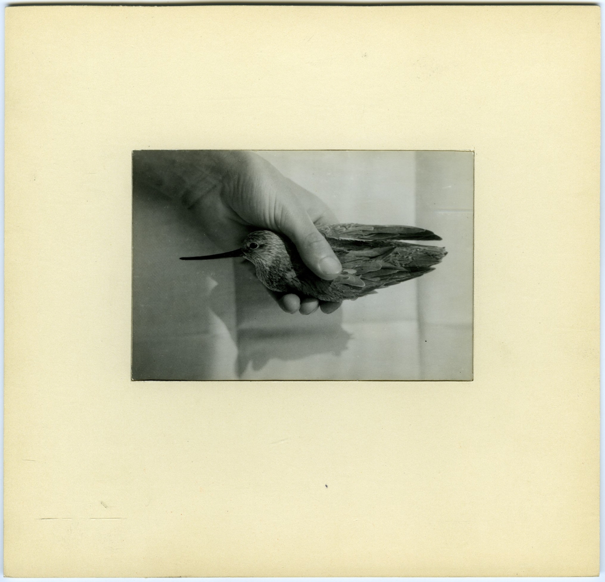 'Bildtext: ''Tereksnäppa, det fjärde i Sverige påträffade exemplaret.'' :: 1 tereksnäppa sedd från sidan, hållen av en människohand. :: :: :: Ingår i serie med fotonr. 7083:1-55.'