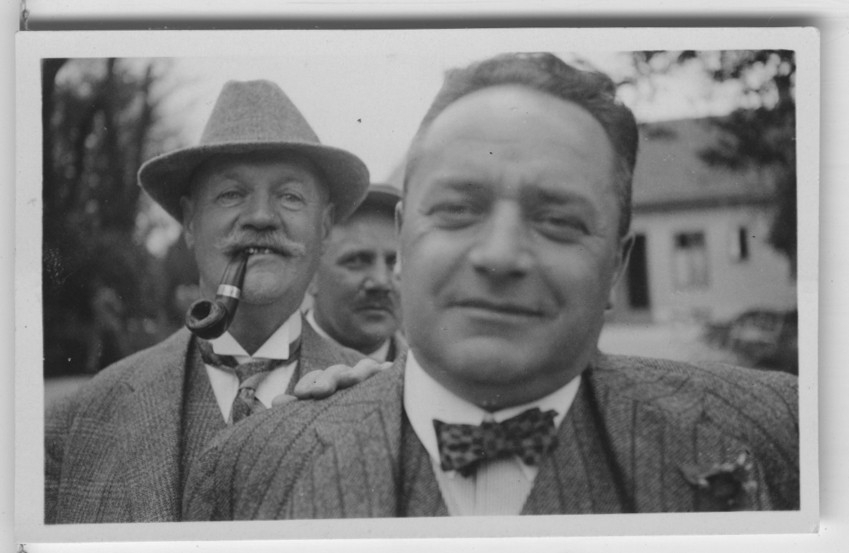 'Göteborgs Biologiska förenings utfärd till Måkläppen och Falsterborev: :: :: Disponent F.J. Willielm och ing. Viktor Bäcksin, bakom står handelsföreståndare Einar Stubelius. Närbild. :: :: Se fotonr. 1384-1395, 1618-1639, 1640-1648 samt 3229 från samma utfärd.'