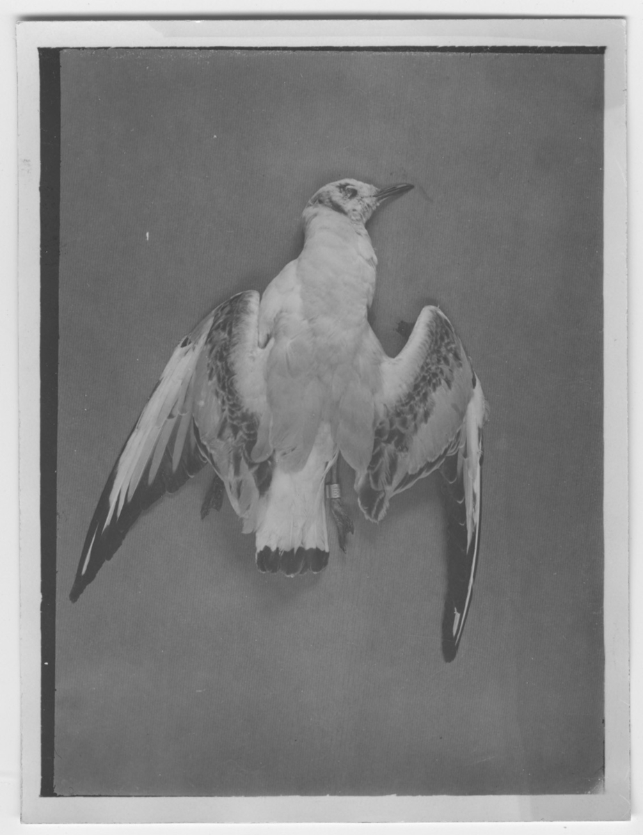 Skrattmås, död, sedd från buksidan. Enligt bildtext: Göteborg Sweden 15125C. Märkt Rone holmar, Gotland, 1929-06-27, återfunnen skadad 1930-01-21 i Genéve. ... Några dog senare och insänd till professor Rob. Poncy (vykort 21/1 1930).