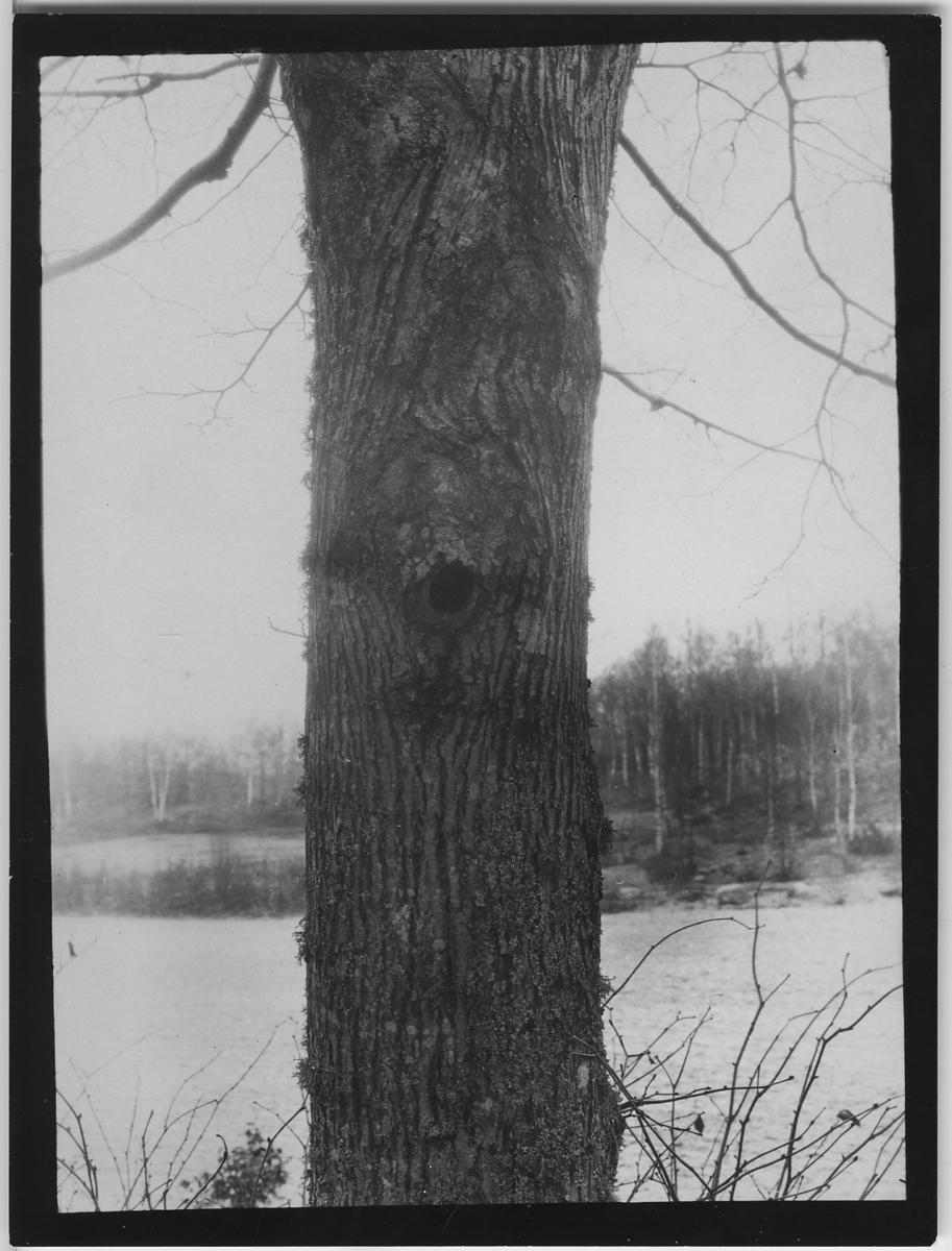 'Gröngöling, bo i lind. Närbild på trädstammen, i fonden vy ut mot ev. sjö. :: :: Ingår i serie med fotonr. 2347-2399.'