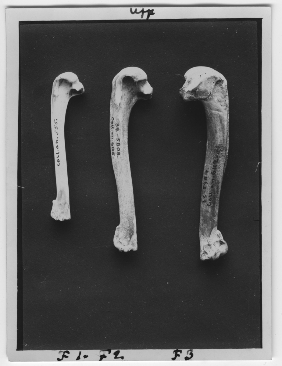 '3 ben av Tordmule och 2 st ben av garfågel. Vänster humerus. Coll.an.555, Coll.an.6112, Coll.an.6115. :: 1932-5808. :: :: :: Ingår i serie med fotonr. 2984-3010, foton och teckningar på dront och garfågel bl.a.'
