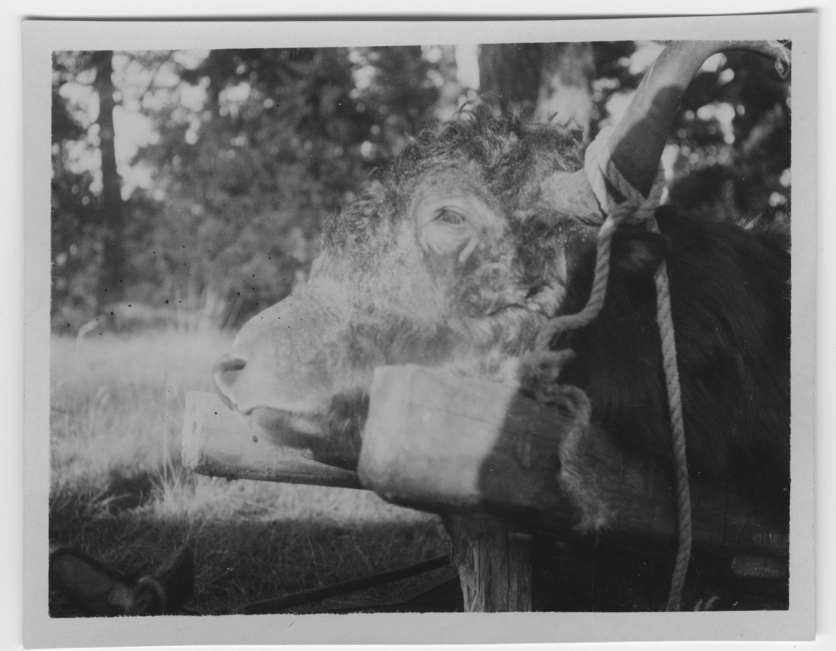 'Jak, hane. Huvudbild, djuret upprätt, rep runt hornet. Skjuten på Rånö av konsul John Gustaf Wibom. :: :: Finns utställd som montage i däggdjurssalen, monterskåp nr. 41 på Göteborgs Naturhistoriska Museum. :: :: Ingår i serie med fotonr. 780-785.'