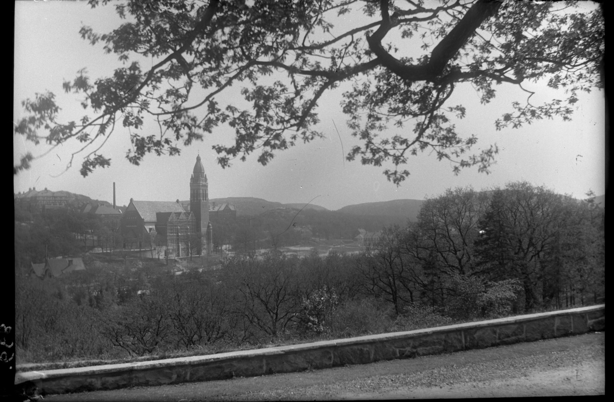 Utsikt från Göteborgs Naturhistoriska museum i Slottsskogen (från ett av fönsteren i Botaniska rummet) åt sydost. Vy mot Annedalskyrkan ev. med byggställning.